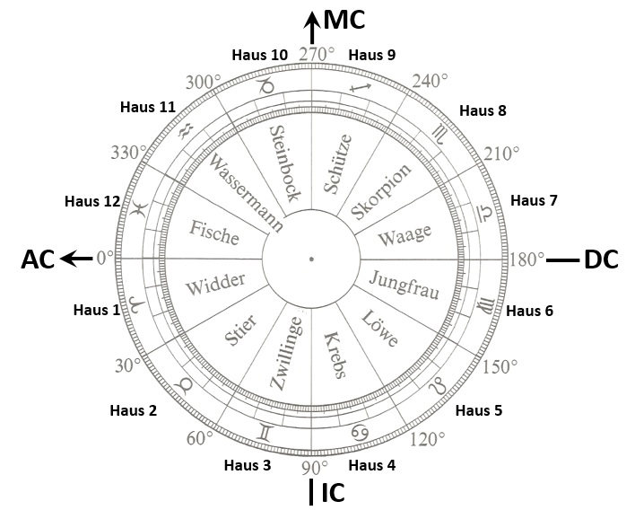 Auf einer Kreisebene sind auf der Karte der Stand von Sonne und Mond, sowie der acht Planeten Merkur, Venus, Mars, Jupiter, Saturn, Uranus, Neptun und Pluto in Bezug auf den Horizont und den Meridian der Erde zu sehen. Dieser Kreis von 360 Grad ist in zwölf Sektoren unterteilt, die von den Astrologen und Astrologinnen Häuser oder Felder genannt werden.