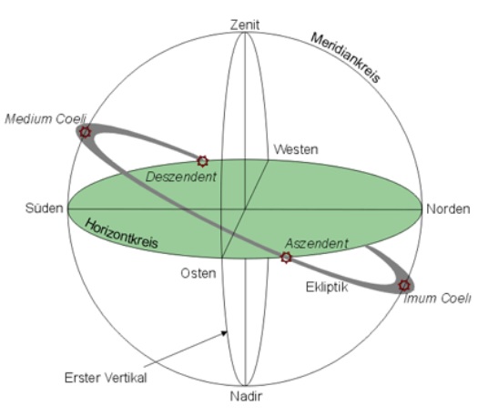 Dem Aszendenten gegenüber liegt am westlichen Horizont der "absteigende" Punkt, wenn die Sonne untergeht. Dieser wird Deszendent (DC) genannt. Der höchste Punkt des Himmelsgewölbes wird Medium Coeli (MC) - Himmelsmitte - genannt, auf der gegenüberliegenden Seite liegt der tiefste Punkt der Erde, das Imum-Coeli (IC) - die Himmelsunterseite.